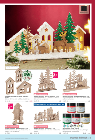 yZum ZusammensteckenVBS Holz-Steckmotiv \Zum Zusammenstecken. Ca. L 24 x B 5 x H 18,5 cm, St%u00e4rke ca. 5 mm. Aus Sperrholz.41270 147,30VBS H%u00e4user-Silhouetten mit Fenster \3er-SetGr%u00f6%u00dfe ca. 15-19 cm, Breite ca. 3,5 cm. Aus MDF-Holz.41241 3813,2010,85yZum ZusammensteckenVBS Holz-Steckmotiv \Zum Zusammenstecken. Ca. L 21 x B 3,5 x H 24,5 cm, St%u00e4rke ca. 5 mm. Aus Sperrholz.41270 076,50+H2O+H2OVBS Bastelfarbe\Inhalt: Je 50 ml in der Farbe Rot, Graubraun, Dunkelgr%u00fcn, Karminrot und Gold. L%u00f6sungsmittelfrei.41275 6023,401l=93,60Nur650Erl%u00e4uterungen zu Icons und Artikeleigenschaften auf S. 57www.vbs-hobby.ch| 5Dekobeispiel mit VBS Deko-Schnee von S. 49.yZum ZusammensteckenVBS Holz-Steckmotiv \Zum Zusammenstecken. Ca. L 22 x B 5 x H 12,5 cm. Aus Sperrholz.41241 365,45yZum ZusammensteckenVBS Holz-Steckmotiv \Zum Zusammenstecken. Ca. L 9,5 x B 3,5 x H 17,5 cm, St%u00e4rke ca. 5 mm. Aus Sperrholz.41270 133,90Nur390Anleitung3453WEITERE VBS BASTELFARBEN AB S. 46! -17%