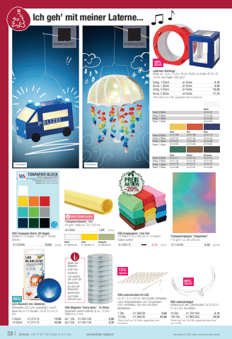 DekobeispielLaternen-RohlingeEckig: ca. 13,5 x 13,5 x 18 cm, Rund: ca. Au%u00dfen-%u00d8 22 x B 10 cm. Aus Papier, 400 g/m%u00b2.Eckig, 1 St%u00fcckJe Farbe4,10Rund, 1 St%u00fcckJe Farbe4,45Eckig, 5 St%u00fcckJe Farbe16,30Rund, 5 St%u00fcckJe Farbe17,75*Beim Kauf von 5 Stk. gegen%u00fcber dem Einzelpreis18%*sparen58 |Schweiz: +41 71 511 23 70 (Mo.-Fr. 9-17 Uhr)service@vbs-hobby.chAlle Preise in CHF sowie versteuert und verzolltVBS Tonpapier-Block, 80 BogenSortiert in 10 Farben. 120 g/m%u00b2. Format DIN A4.41239 0613,951m%u00b2=2,23yMehr Farben onlineTransparentpapier \42 g/m%u00b2, Rolle ca. 70 x 100 cm.Je Farbe1,501m%u00b2=2,14VBS Krepppapier, 14er-Set14 Rollen %u00e0 10 x 200 cm, in 14 versch. Farben sortiert.41240 193,903,101m%u00b2=1,11Transparentpapier \115 g/m%u00b2, ca. 50 x 60 cm.41123 265,351m%u00b2=17,83NEULED Blaulicht inkl. BatterienBlinkendes LED Licht, wasserfest, Leuchtdauer bis zu 12 Stunden. Ca. %u00d8 3 x H 2,3 cm.2 St%u00fcck41274 1410,9510 St%u00fcck41274 1544,95VBS Magnete \Besonders starke Haftkraft. %u00d8 ca. 10 mm, St%u00e4rke ca. 2 mm.ab 1 Stk.41440 1285,90ab 3 Stk.41440 1285,25VBS Laternenstab mit LEDCa. %u00d8 1,2 x L 50 cm. Mit Schalter. Kaltwei%u00dfes Licht. Batteriebetrieben mit 3 Knopfzellen LR41 (enthalten). Aus Holz mit einem Metallhaken.1 Stk.41268 294,6510 Stk.41268 3042,95*Beim Kauf von 10 St%u00fcck, gegen%u00fcber dem EinzelkaufVBS Laternenb%u00fcgelHalterung f%u00fcr den Laternenstab. Ca. B 20,5 x H 16,5 cm. Aus Metall.10 Stk.41700 1843,10100 Stk.41860 25316,45*Beim Kauf von 100 Stk. gegen%u00fcber dem Kauf von 10 Stk.Dekobeispiel Ich geh%u2019 mit meiner Laterne... Wei%u00dfGelbHellgr%u00fcn41706 841 0041706 841 1241706 841 51-20%Anleitung3427Anleitung348546%*sparen13%*sparenKlebe vier Magnete unter das Autodach und weitere vier unter die Blaulichter. So sind die Blaulichter abnehmbar und halten dennoch gut.Wei%u00dfRund, 5 St%u00fcck41211 07Eckig, 5 St%u00fcck41211 00Eckig, 1 St%u00fcck41213 66Rund, 1 St%u00fcck41213 82GelbRotBlauRund, 5 St%u00fcck41211 0841211 0941211 10Eckig, 5 St%u00fcck41211 0141211 0241211 03Eckig, 1 St%u00fcck41213 6741213 6841213 69Rund, 1 St%u00fcck41213 8341213 8441213 85Gr%u00fcnBraunSchwarzRund, 5 St%u00fcck41211 1141211 1241211 13Eckig, 5 St%u00fcck41211 0441211 0541211 06Eckig, 1 St%u00fcck41213 7041213 7141213 72Rund, 1 St%u00fcck41213 8641213 8741213 88