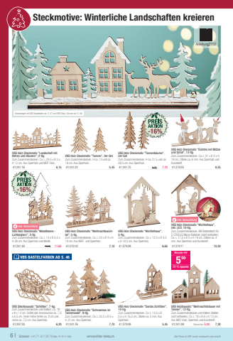 Dekobeispiel mit VBS Bastelfarbe von S. 47 und VBS Deko-Schnee von S. 49.6 |Schweiz: +41 71 511 23 70 (Mo.-Fr. 9-17 Uhr)service@vbs-hobby.chAlle Preise in CHF sowie versteuert und verzolltVBS Holz-Steckmotiv \Zum Zusammenstecken. H ca. 13 und ca. 18 cm. Aus Sperrholz.41241 225,45VBS Holz-Steckmotiv \10-tlg.Zum Zusammenstecken. Ca. L 13,5 x B 5,5 x H 15,5 cm, St%u00e4rke ca, 5 mm. Aus Sperrholz.41270 095,45VBS Holz-Steckmotiv \Rehen und H%u00e4usern\Zum Zusammenstecken. Ca. L 29,5 x B 3 x H 12 cm. Aus Sperrholz und MDF-Holz.41241 166,15yinkl. BeleuchtungVBS Holz-Steckmotiv \inkl. LED, 10-tlg.Zum Zusammenstecken. Mit Batteriefach f%u00fcr 2 CR2032 Micro-Batterien (nicht enthalten). Ca. L 17,5 x B 5 x H 19 cm, St%u00e4rke ca. 4 mm. Aus Sperrholz und Kunststoff.41270 1110,20VBS Holz-Steckmotiv \5-tlg.Zum Zusammenstecken. Ca. L 12,5 x B 4,5 x H 18,5 cm. Aus Sperrholz.41270 396,65VBS Holz-Steckmotiv \tel\Zum Zusammenstecken. Ca. L 24 x B 4 x H 19 cm. Aus MDF- und Sperrholz.41270 107,10VBS Holz-Steckmotiv \Tannenwald\Zum Zusammenstecken. Ca. L 22,5 x B 5 x H 21 cm. Aus Sperrholz.41241 767,70VBS Steckbausatz \Zum Zusammenstecken und Kleben. Ca. 18 x 8 x 12 cm. Gr%u00f6%u00dfe des Innenraumes ca. 7,5 x 6,5 cm. Innen-H%u00f6he hinten ca. 9 cm und vorne ca. 7,5 cm. Aus Sperrholz.41207 306,20Anleitung3102VBS Holz-Steckmotiv %und Schal\Zum Zusammenstecken. Ca. L 31 x B 4 x H 18 cm, St%u00e4rke ca. 6 mm. Aus Sperrhplz und Kunststoff.41270 258,55VBS Holzbausatz \Tannen\Zum Zusammenstecken und Kleben (Kleber nicht enthalten). Ca. L 18 x B 6 x H 13 cm. Aus MDF-Holz, Sperrholz und Kunststoff.41241 09November 5,007,30Monats-Hit50031 % sparenVBS Holz-Steckmotiv \2er-SetZum Zusammenstecken. H ca. 21,5 und ca. 28,5%u00a0cm. Aus Sperrholz.41241 759,257,70-16%-16% VBS BASTELFARBEN AB S. 46 Steckmotive: Winterliche Landschaften kreieren yinkl. BeleuchtungVBS Holz-Steckmotiv \Lichterglanz\Zum Zusammenstecken. Ca. L 15 x B 5,5 x H 26 cm. Aus Sperrholz und Metall.41241 4013,9511,65