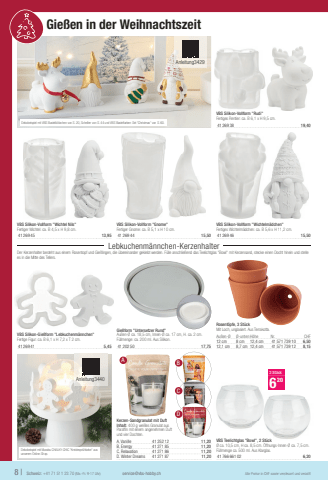 Dekobeispiel mit VBS Bastelkl%u00f6tzchen von S. 20, Schellen von S. 44 und VBS Bastelfarben-Set \s\VBS Silikon-Vollform \Fertiger Wichtel: ca. B 4,5 x H 9,8 cm.41269 4513,95VBS Silikon-Vollform \Fertiges Wichtelm%u00e4dchen: ca. B 5,6 x H 11,2 cm.41269 4615,50VBS Silikon-Gie%u00dfform \Fertige Figur: ca. B 6,1 x H 7,2 x T 2 cm.41269 415,45Gie%u00dfform \Au%u00dfen-%u00d8 ca. 18,5 cm, Innen-%u00d8 ca. 17 cm, H. ca. 2 cm. F%u00fcllmenge: ca. 200 ml. Aus Silikon.41202 5017,75Rosent%u00f6pfe, 3 St%u00fcckMit Loch, unglasiert. Aus Terrakotta.Au%u00dfen-%u00d8%u00d8-untenH%u00f6heNr.CHF12 cm8 cm12,4 cm41571 739 106,5012,1 cm8,7 cm12,4 cm41571 739 128,15VBS Silikon-Vollform \Fertiger Gnome: ca. B 5,1 x H 10 cm.41269 4415,50Kerzen-Sandgranulat mit DuftInhalt: 400 g wei%u00dfes Granulat%u00a0aus Paraffi n mit einem angenehmen%u00a0Duft und%u00a0vier Dochten.A. Vanille41252 1211,20B. Energy41271 8511,20C. Relaxation41271 8611,20D. Winter Dreams41271 8711,20VBS Teelichtglas \%u00d8 ca. 10,5 cm, H ca. 8,5 cm. %u00d6ffnungs-Innen-%u00d8 ca. 7,5 cm. F%u00fcllmenge ca. 500 ml. Aus Klarglas.41766 661 026,20VBS Silikon-Vollform \Fertiges Rentier: ca. B 6,1 x H 9,5 cm.41269 3819,402 St%u00fcck6208 |Schweiz: +41 71 511 23 70 (Mo.-Fr. 9-17 Uhr)service@vbs-hobby.chAlle Preise in CHF sowie versteuert und verzolltDekobeispiel mit Marabu CHALKY-CHIC %unserem Online-Shop.Anleitung3429 Lebkuchenm%u00e4nnchen-Kerzenhalter Gie%u00dfen in der Weihnachtszeit Der Kerzenhalter besteht aus einem Rosentopf und Gie%u00dflingen, die %u00fcbereinander geklebt werden. F%u00fclle anschlie%u00dfend das Teelichtglas \es in die Mitte des Tellers.Anleitung3440ABCD