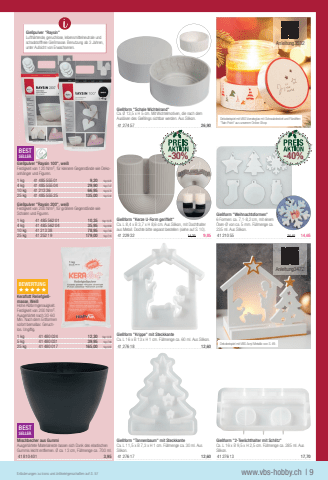 BESTSELLERGie%u00dfpulver \Festigkeit von 120 N/m%u00b2,f%u00fcr kleinere Gegenst%u00e4nde wie Dekoanh%u00e4nger und Figuren.1 kg41485 555 019,201kg=9,204 kg41485 555 0429,901kg=7,4710 kg41213 3666,951kg=6,7025 kg41485 555 25135,001kg=5,40Gie%u00dfpulver \Festigkeit von 200 N/m%u00b2, f%u00fcr gr%u00f6%u00dfere Gegenst%u00e4nde wie Schalen und Figuren. 1 kg41485 562 0110,351kg=10,354 kg41485 562 0435,951kg=8,9910 kg41213 3878,951kg=7,8925 kg41252 19179,001kg=7,16BEWERTUNGxxxxxKerafl ott Reliefgie%u00dfmasse, Wei%u00dfHohe Abformgenauigkeit. Festigkeit von 200 N/m%u00b2. Ausgeh%u00e4rtet nach 30-60 Min. Nach dem Entformen sofort bemalbar. Geruchlos. Ungiftig.1 kg41480 02412,301kg=12,305 kg41480 03139,951kg=7,9925 kg41480 017165,001kg=6,60Gie%u00dfform \Ca. L 16 x B 13 x H 1 cm. F%u00fcllmenge ca. 60 ml. Aus Silikon.41276 1812,60Gie%u00dfform \Ca. L 16 x B 9,5 x H 2,5 cm. F%u00fcllmenge ca. 285 ml. Aus Silikon.41276 1317,70BESTSELLERMischbecher aus GummiAusgeh%u00e4rtete Materialreste lassen sich Dank des elastischen Gummis leicht entfernen. %u00d8 ca. 13 cm, F%u00fcllmenge ca. 700 ml.41810 4013,95Gie%u00dfform \Ca. L 11,5 x B 7,3 x H 1 cm. F%u00fcllmenge ca. 30 ml. Aus Silikon.41276 1712,60Erl%u00e4uterungen zu Icons und Artikeleigenschaften auf S. 57www.vbs-hobby.ch| 9Gie%u00dfform \Ca. L 8,4 x B 3,7 x H 8,6 cm. Aus Silikon, mit Dochthalter aus Metall. Dochte bitte separat bestellen (siehe auf S. 10).41229 3214,209,85Gie%u00dfform \6 Formen: ca. 7,1-8,2 cm, mit einem %u00d6sen-%u00d8 von ca. 5 mm. F%u00fcllmenge ca. 235 ml. Aus Silikon.41210 5524,4514,65Gie%u00dfform \Ca. %u00d8 13,5 x H 5 cm. Mit Wichtelmotiven, die nach dem Ausl%u00f6sen des Gie%u00dflings sichtbar werden. Aus Silikon.41274 5726,90Dekobeispiel mit VBS Vorratsglas mit Schraubdeckel und Filzstiften \opDekobeispiel mit VBS Acryl Metallic von S. 49.-40%Anleitung3472Anleitung3532-30%Gie%u00dfpulver \Lufth%u00e4rtende, geruchlose, lebensmittelneutrale und schadstofffreie Gie%u00dfmasse. Benutzung ab 3 Jahren, unter Aufsicht von Erwachsenen.