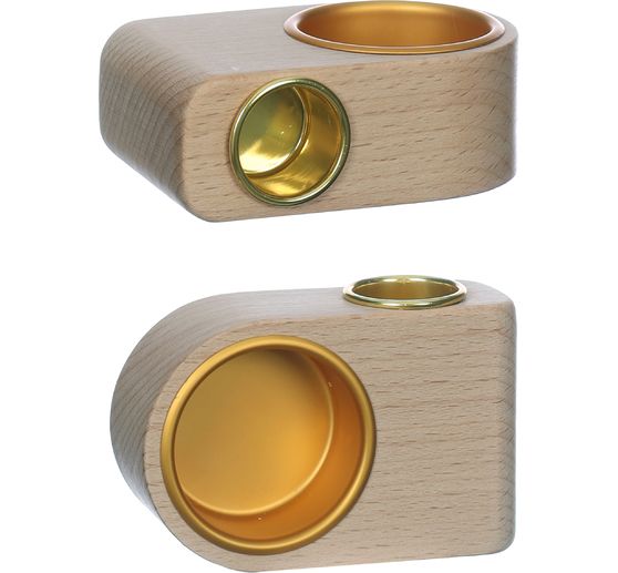 Entdecke die Vielseitigkeit unseres eleganten Kerzenhalters aus Rohholz mit goldenen Tüllen! Dieser stilvolle Kerzenhalter bietet dir die Möglichkeit, sowohl eine Stabkerze als auch ein Teelicht zu verwenden. Mit einem Innen-Durchmesser von 2,2 cm für Stabkerzen und 4 cm für Teelichter, passt er sich flexibel deinen Dekorationswünschen an.