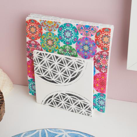 Tupfe das Motiv mit einem Stupfpinsel und Metallicfarbe aus. Die schimmernde Farbe setzt elegante Akzente und hebt das Muster besonders schön hervor. Entferne die Schablone vorsichtig, reinige sie mit Wasser und wiederhole den Vorgang bei Bedarf. Lass den Serviettenhalter anschließend vollständig trocknen.