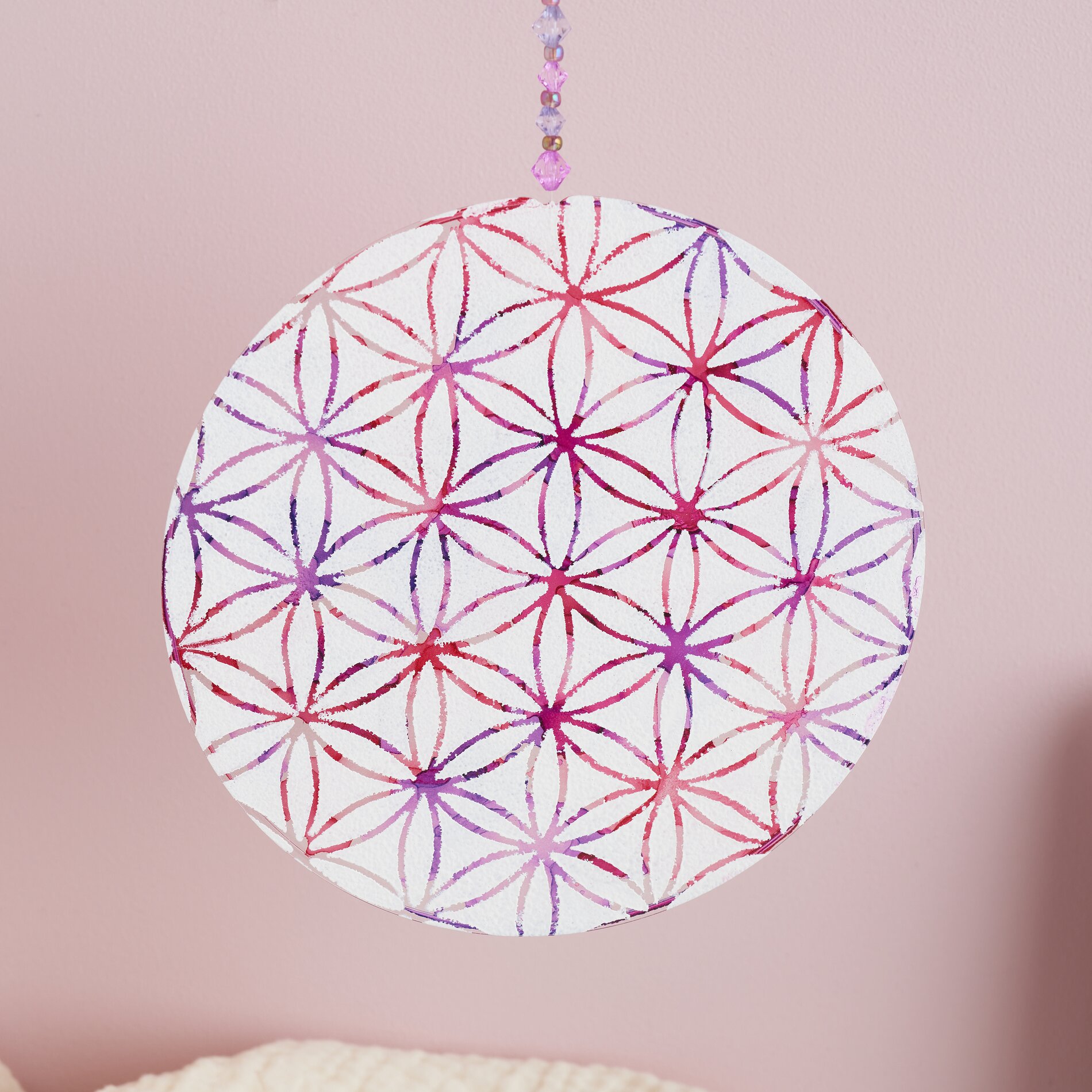 Drehe die Scheibe um und bringe die mit Sprühkleber versehene Schablone auf der unbehandelten Seite an. Tupfe das Motiv mit Bastelfarbe aus, entferne die Schablone und reinige sie sofort. Nach dem Trocknen bohrst du mit einem Handbohrer ein kleines Loch in die Acrylscheibe. Fädle Perlonfaden hindurch, ziehe Perlen nach Wunsch auf und knote die Enden zusammen – fertig ist dein dekorativer Hingucker.