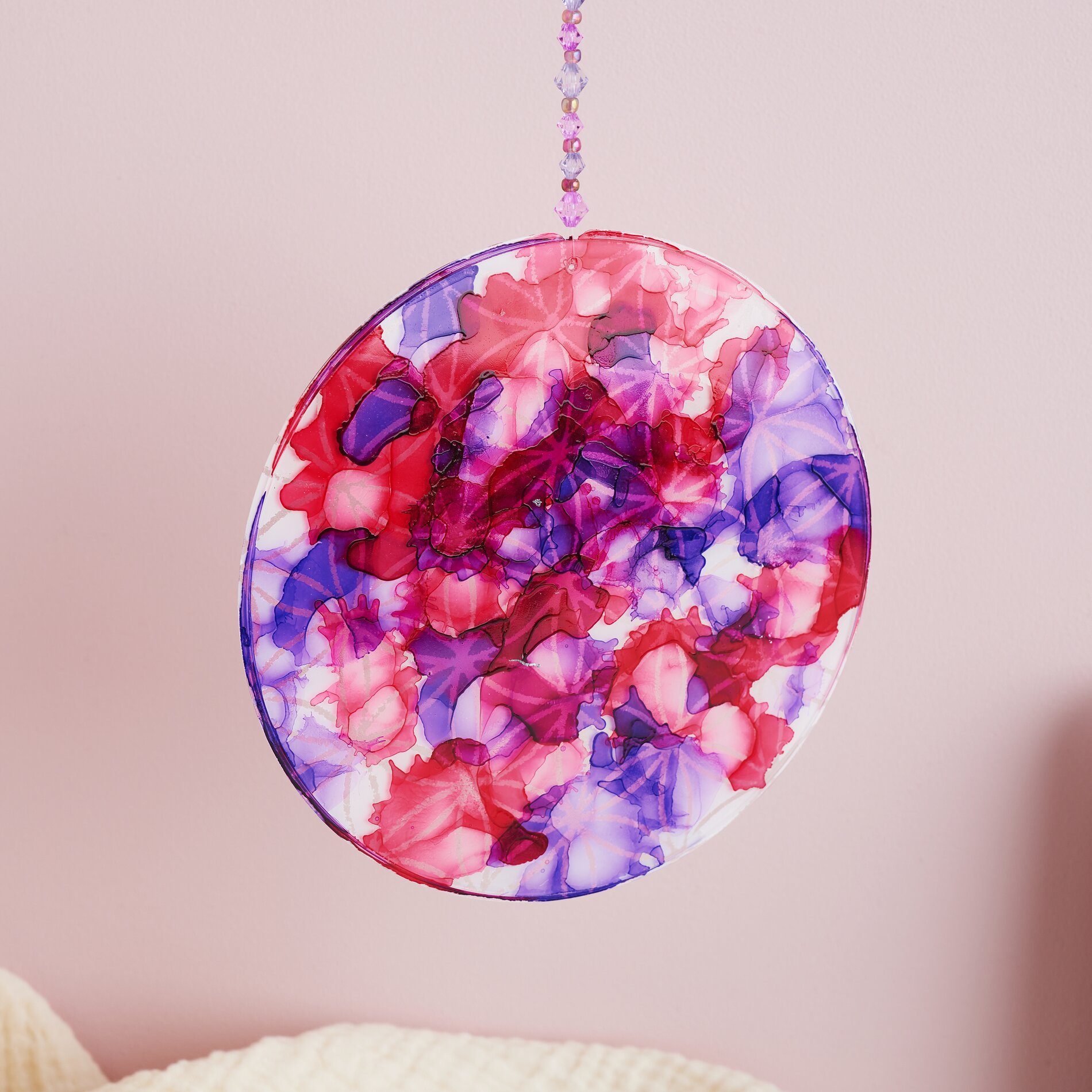 Gestalte zuerst eine Seite der runden Acryl-Trenn- und Malscheibe mit Alcohol Ink. Gib einige Tropfen der Tinte auf die Oberfläche – sie breitet sich von selbst aus. Setze weitere Farben daneben, sodass sie sich gegenseitig verdrängen und spannende Farbeffekte entstehen. Durch leichtes Pusten kannst du die Tinte bewegen und weichere Farbverläufe erzeugen. Lass die Fläche komplett trocknen.