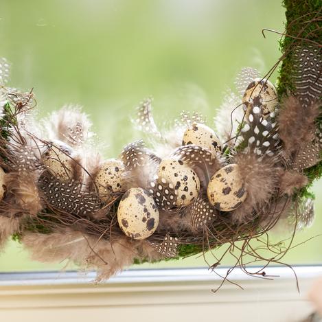 Setze die Wachteleier vorsichtig auf die Deko-Weide. Stecke natürliche Federn in den Kranz. Dekoriere mit den Holzstreuteilen oder anderen Naturmaterialien. Befestige sie mit Heißkleber. Klebefäden oder zu viel aufgetragener Heißkleber lässt sich entfernen, sobald der Leim abgekühlt ist.