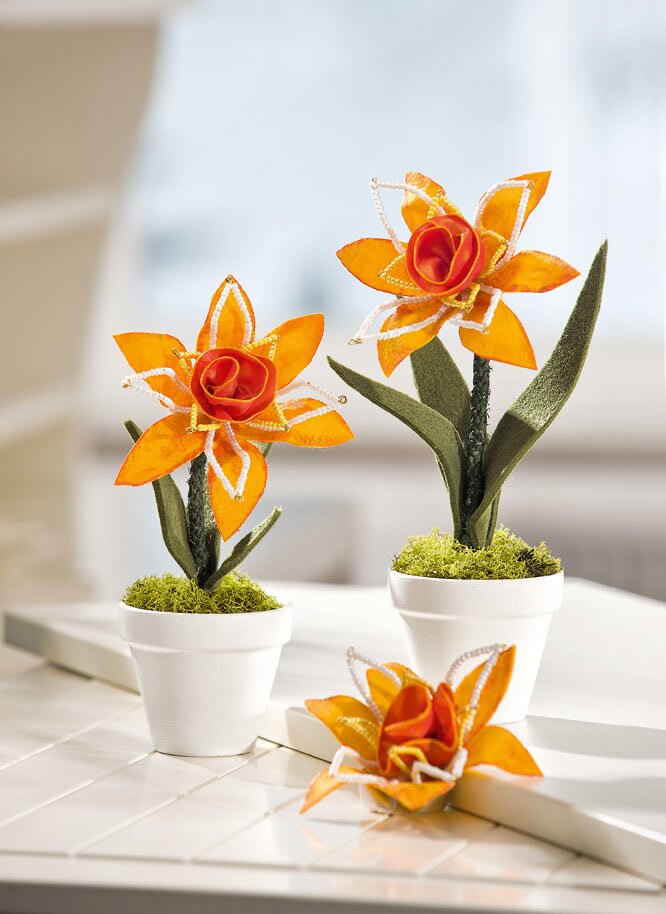 Leuchtende Osterglocken aus Filz und Perlensternen gelingen mit dieser Anleitung ganz schnell und einfach. In Kombination mit schlicht-weißen Tontöpfen wirken sie besonders hübsch.