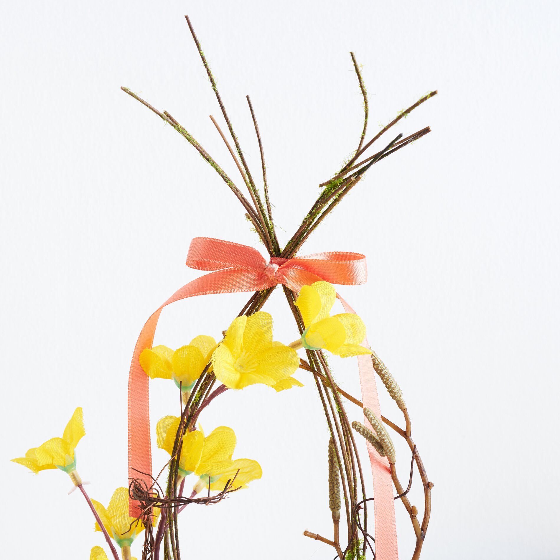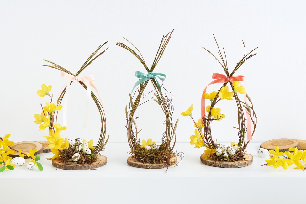 Du kannst nach Belieben ein paar Stränge des Forsythienzweigs, der Deko-Weide oder des Weidenkätzchens in das Bündel integrieren. Diese Elemente verleihen deinem Arrangement zusätzlichen Charme und eine Frühlingsnote.