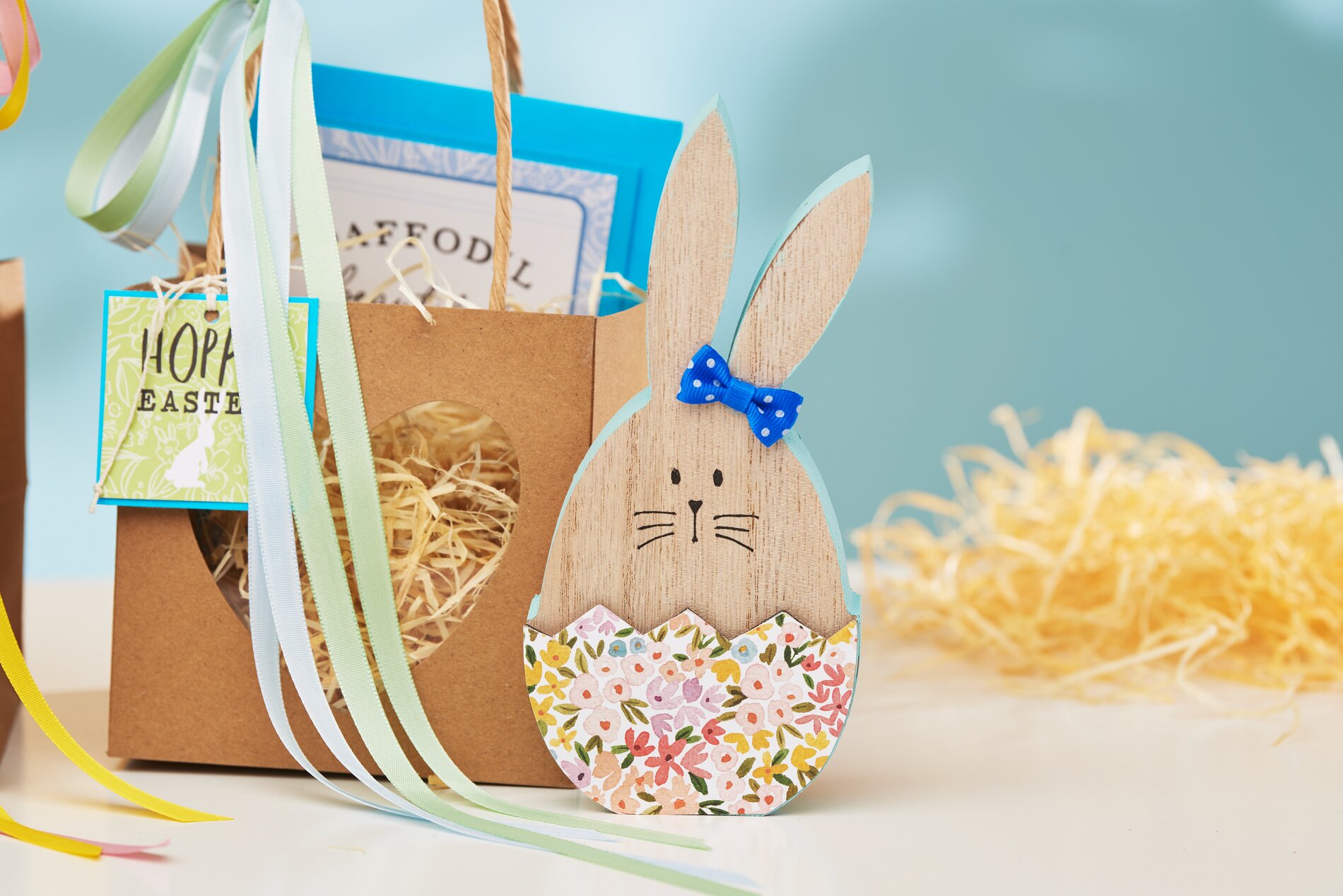 Jetzt beklebst du die Eierschale vom Hasen „Bonnie“ mit Papier. Nimm dazu ein Scrapbook-Papier Ihrer Wahl. Platziere „Bonnie“ auf dem Papier und übertrage mit einem Bleistift die Umrisse der Eierschale. Da man die Zacken noch nicht übertragen kann, lassen wir dafür erst einmal genügend Platz, um diese später noch hinzufügen zu können.
