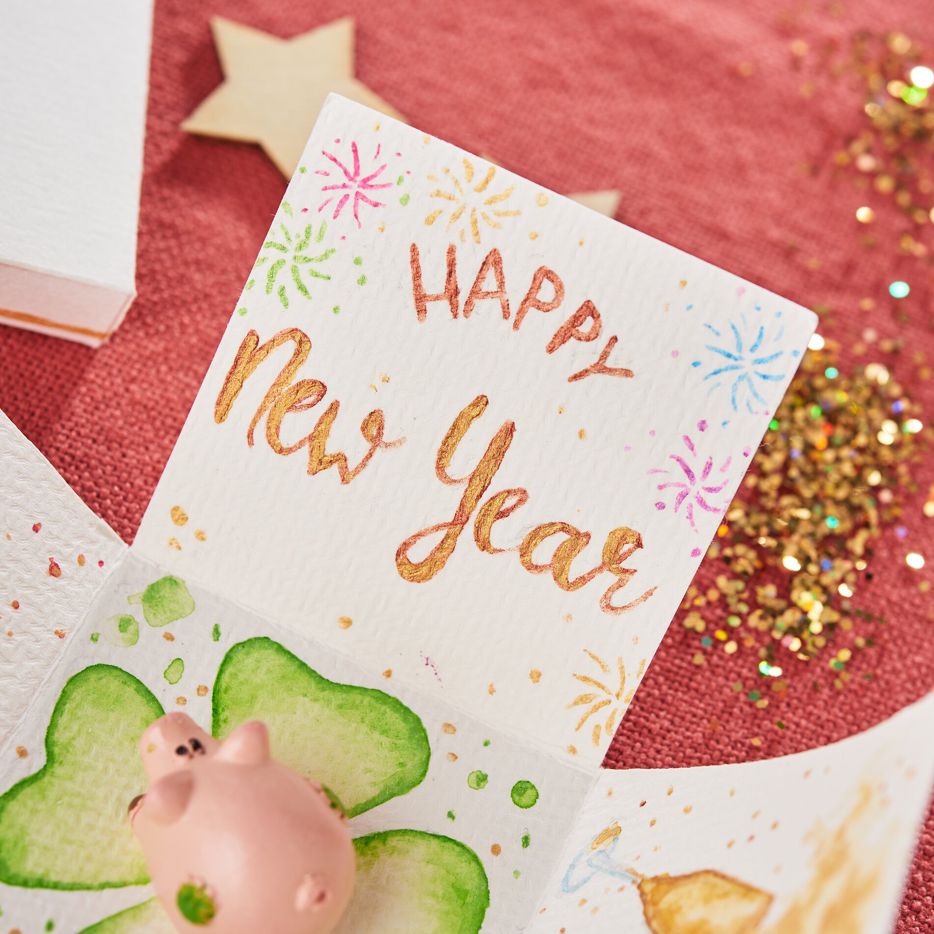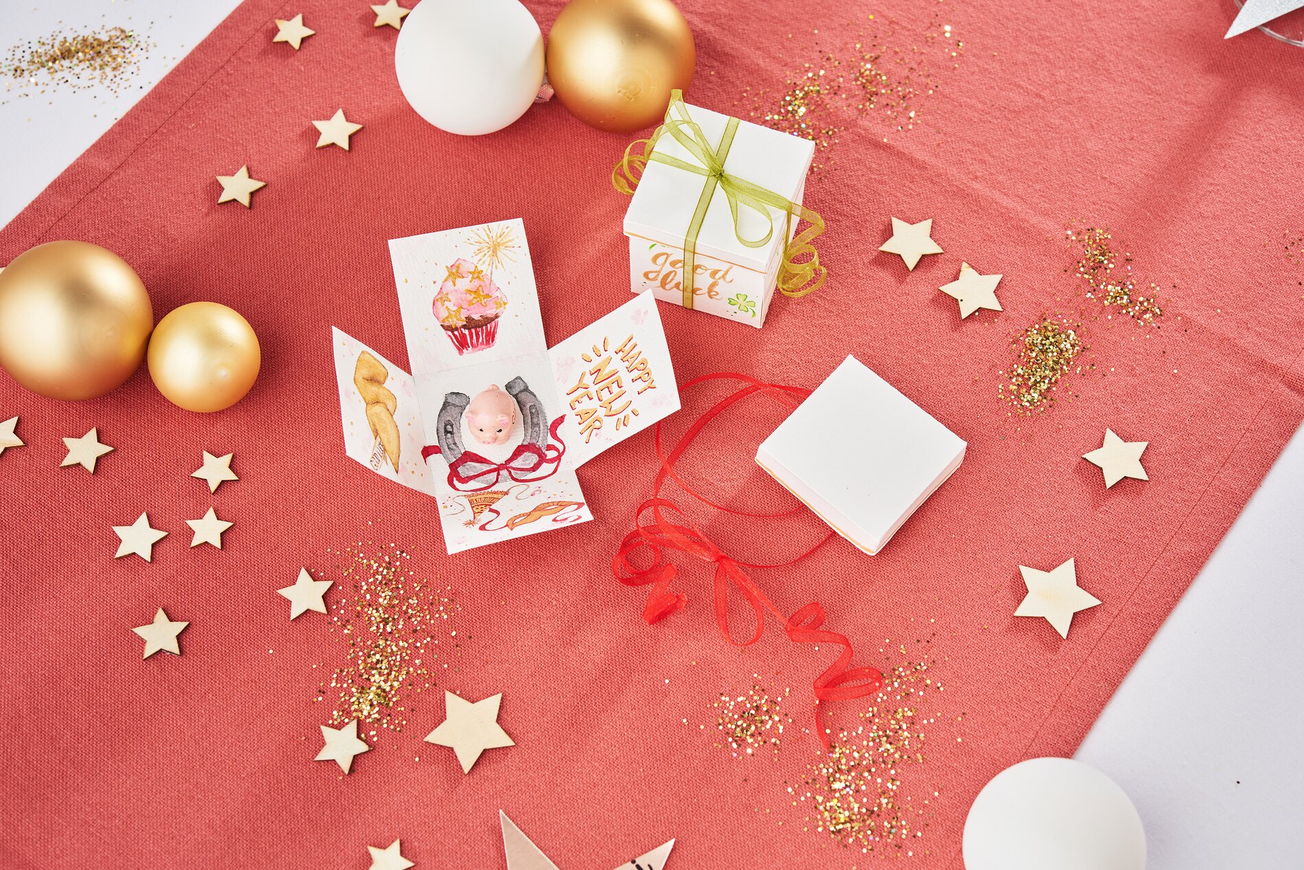 Setze abschließend das Schweinchen oder ein anderes Dekoelement in das Kästchen, setze den Deckel auf und befestige ihn mit einer dekorativen Schleife. Um das Schleifenband zu kräuseln, kannst du es einfach mit dem Daumen und einer Schere entlangziehen.