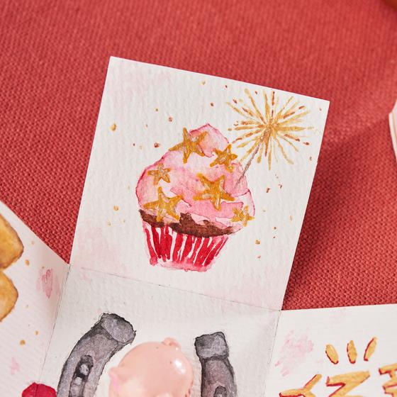 Gib ein paar Tropfen Wasser in die Farbnäpfchen, die du verwenden möchtest, um die Aquarellfarben zu aktivieren. Bevor du die Farben auf das Kästchen aufträgst, teste sie auf einem Schmierblatt. Experimentiere mit unterschiedlichen Wassermengen sowie verschiedenen Pinselstärken, um die Ergebnisse deinen Wünschen entsprechend zu gestalten.