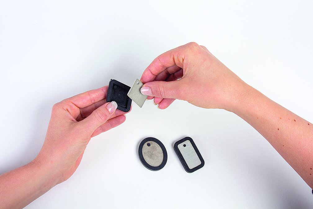 Die Gießmasse kann nach ca. einem halben Tag aus der Form entnommen werden. Richtig durchgehärtet und somit robust genug für die Weiterverarbeitung ist der gegossene Schmuckanhänger nach ca. 24 Stunden.