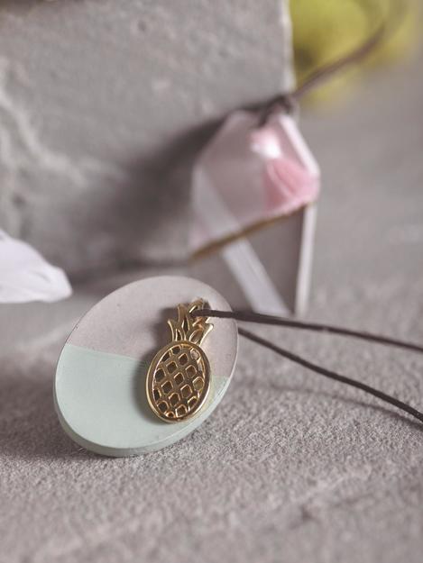 Das gleich mit gegossene Anhängeloch einfach mit einem Lederband oder eine Metallkette versehen und ganz nach persönlichem Geschmack ein kleines Metallaccssoire vor den Beton-Anhänger binden.