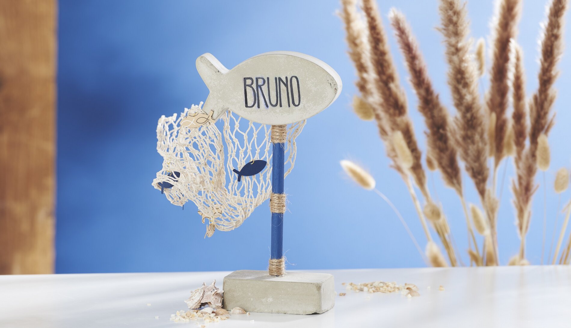 5. Der Rundstab wird mit Bastelfarbe in Marineblau bemalt. Mit der gleichen Bastelfarbe schreiben Sie den Namen auf den Betonfisch. Trocknen lassen.