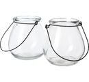 VBS Windlicht aus Glas mit einer Höhe von ca. 10,8 cm und einem Ø außen von ca. 10 cm. Sie erhalten 2 Windlichter. Die Öffnung oben hat einen Ø von ca. 5,5 cm und die Stellfläche beträgt ca. 6,5 cm. Oben am Rand ist ein Drahtbügel befestigt mit dem das Windlicht aufgehängt werden kann.