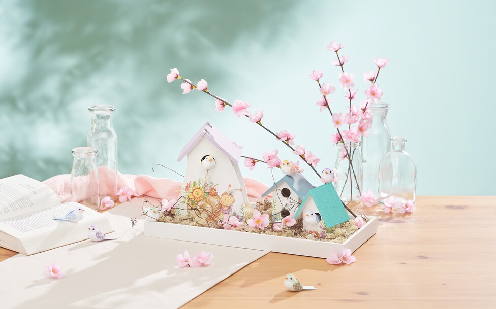 Lege das Tablett dekorativ mit Islandmoos aus, das eine natürliche Basis bildet. Stelle die verzierten Vogelhäuser darauf. Kürze den Kirschblütenzweig mit einem Seitenschneider und platziere ihn kunstvoll auf dem Tablett. Zum Schluss befestigst du kleine Deko-Vögel mit Heißkleber auf dem Kirschblütenzweig.